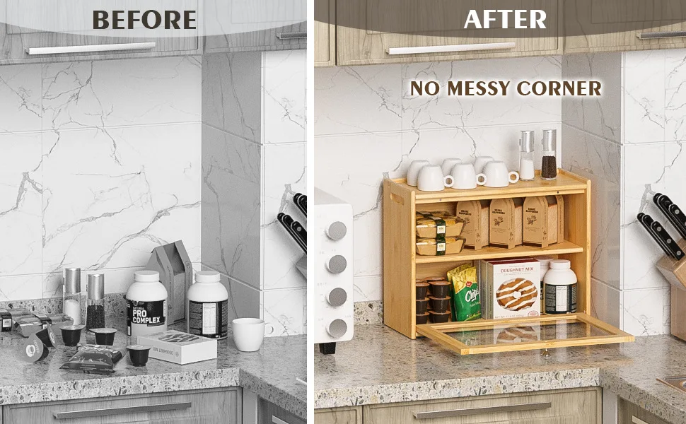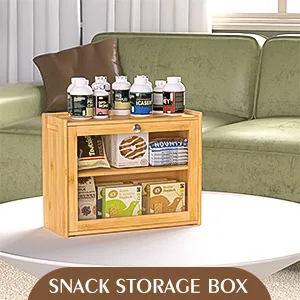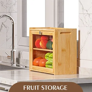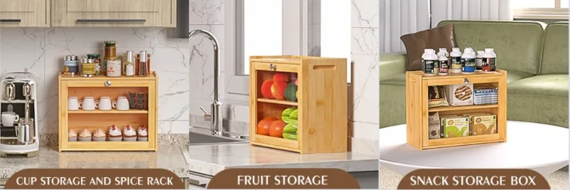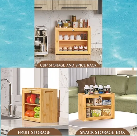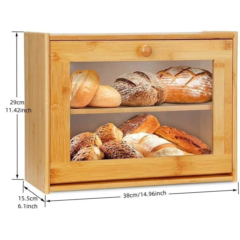In Stock Modern Eco-friendly Bamboo Double Layer Square Bread Box with Transparent Glass Lid for Kitchen Condiment Storage