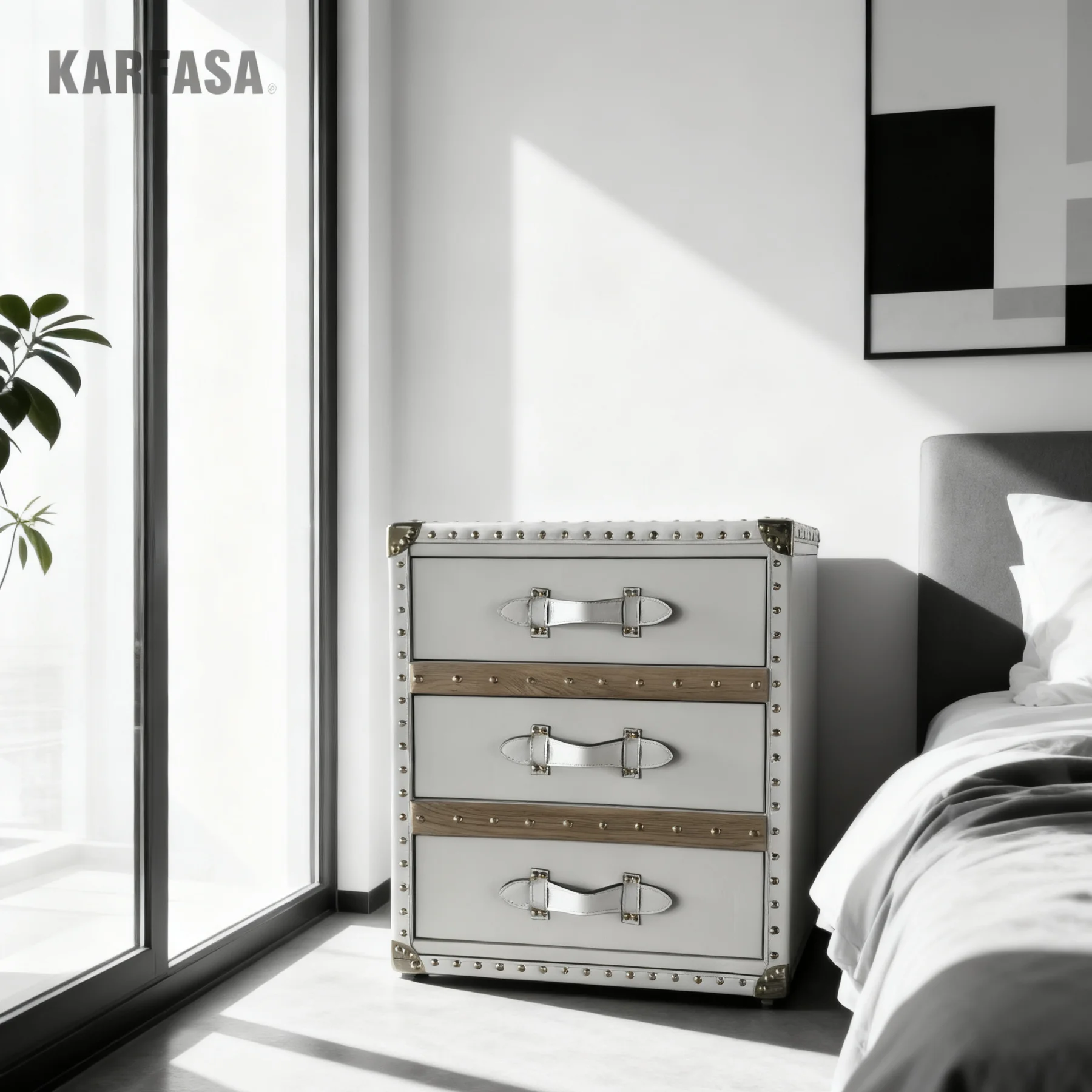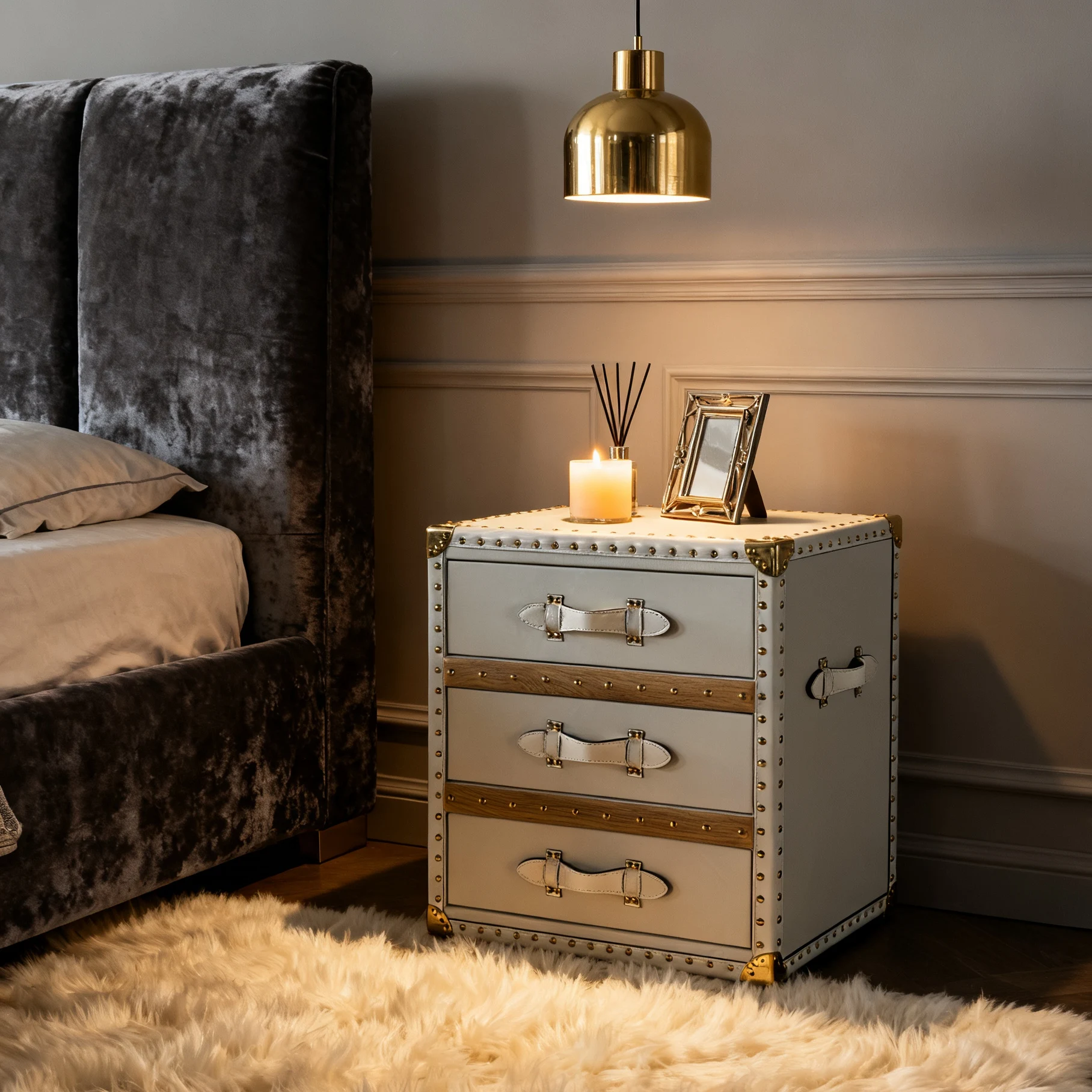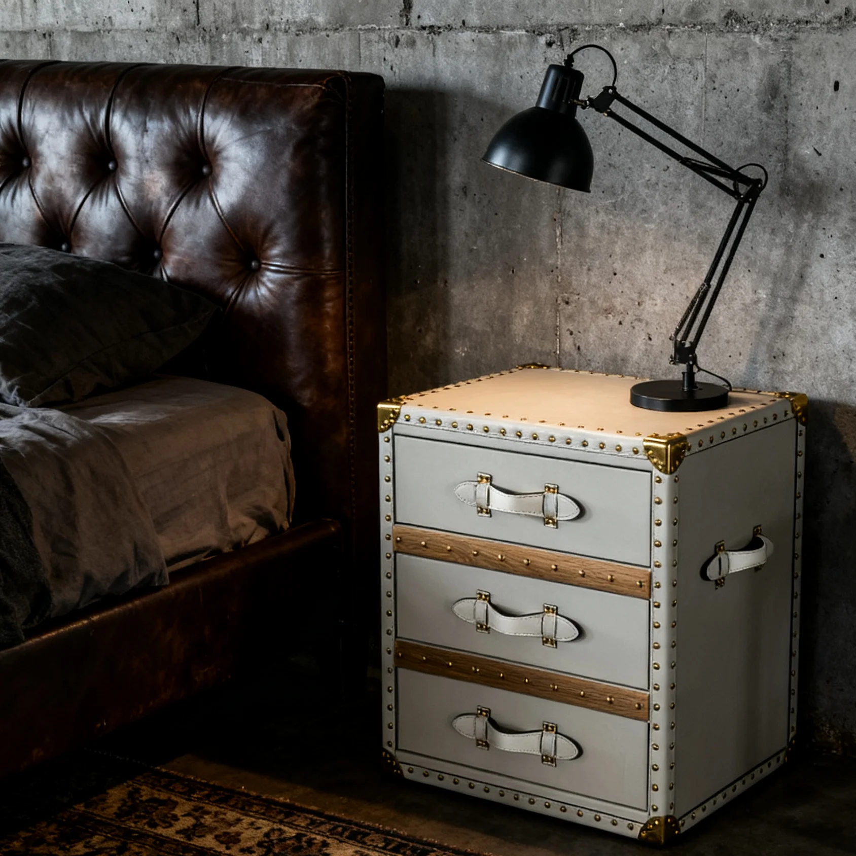 Industrial Side Cabinet Bedside Table 3 Drawers Leather Storage Box Stylish Golden Mushroom Nail Design for Home Bar Bedroom