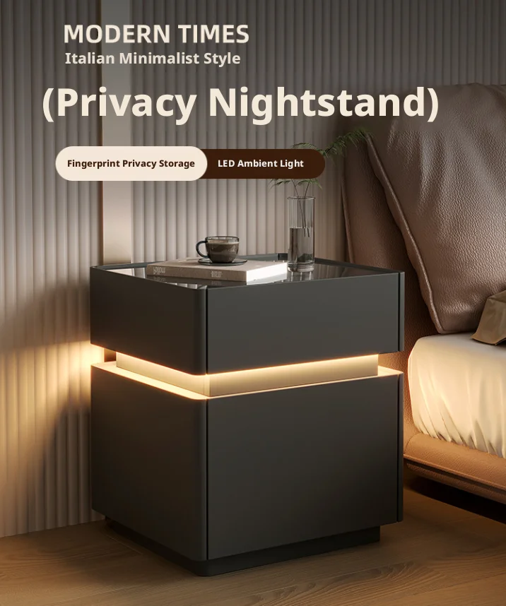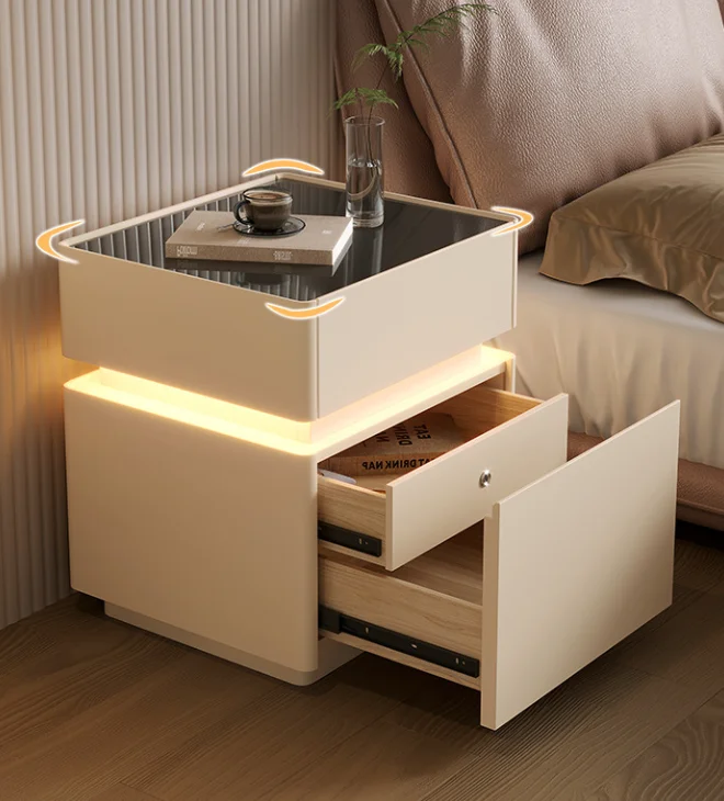 Smart Nightstand With Wireless Charging LED Light Fingerprint Lock 2 Drawers Modern Minimalist Solid Wood Bedroom FurnitureSmart Bedside Table Bluetooth Speaker USB Port Charging Station Glass Top Light Luxury White Leather Living Room Hotel Use