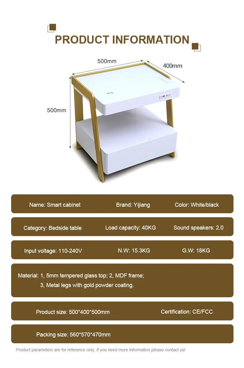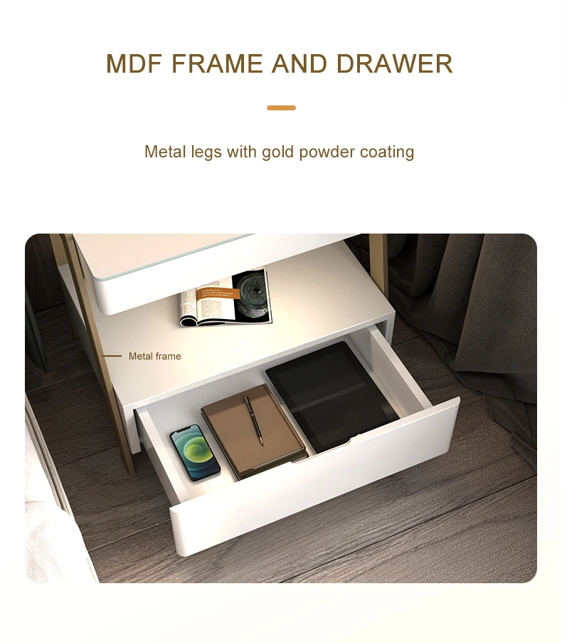 1, Tempered glass top 2, MDF frame and drawer 3, Metal legs with gold powder coating 4, 10W Wireless charging function